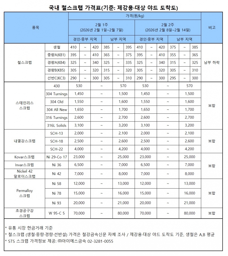 반면 이 기간 남부권 철스크랩 가격은 설 연휴를 앞두고 고점 인식과 함께 대한제강과 YK스틸, 한국철강 등의 인하로 전 등급에서 톤당 1만원 하락했다.