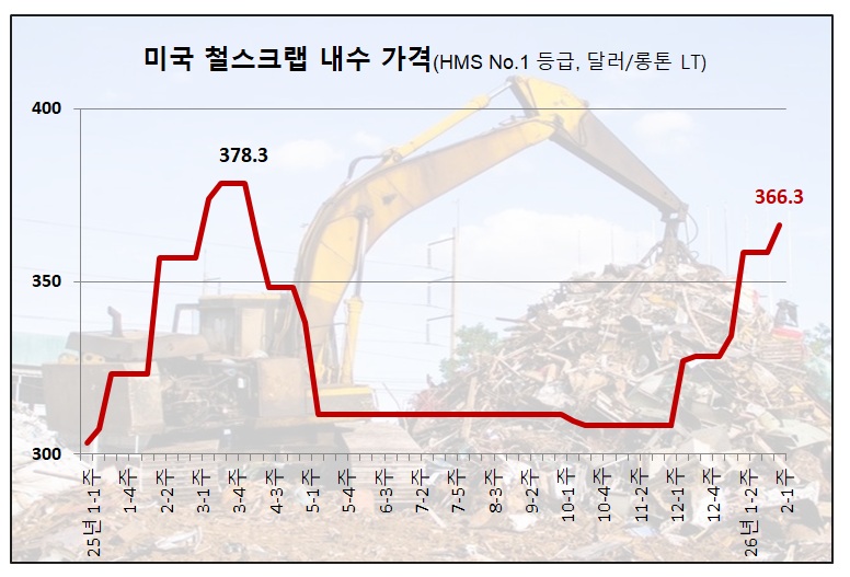 2월 첫째 주 미국 HMS No.1 등급 철스크랩 컴포짓 프라이스는 롱톤(LT)당 366.6달러로 전주 대비 8달러 오르며 3주 만에 추가 상승했다. 컴포짓 프라이스는 미국 동부 피츠버그, 시카고, 필라델피아에서 거래된 철스크랩 평균 가격이다.