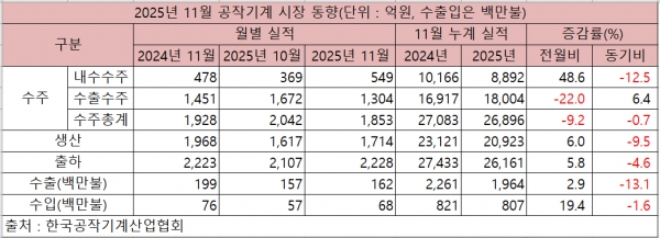 11월 누적 기준 공작기계 수주는 2조6,896억 원으로 전년 동기 대비 0.7% 감소했다. 내수수주는 8,892억 원으로 전년 동기 대비 12.5% 감소한 반면, 수출수주는 1조8,004억 원으로 전년 동기 대비 6.4% 증가했다.