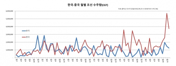 中 67% 점유…1월 선박 수주, 한·중 격차 확대