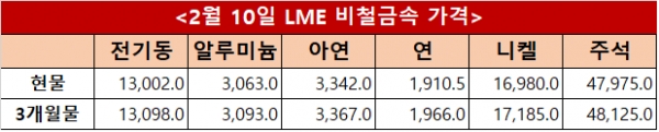 런던금속거래소(LME) 10일(현지시간) 기준 전기동 현물과 3개월물은 각각 톤당 13,002달러와 13,098달러를 기록했으며 알루미늄은 3,063달러와 3,093달러, 아연은 3,342달러와 3,367달러로 집계됐다. 연은 1,910.5달러와 1,966달러, 니켈은 16,980달러와 17,185달러, 주석은 47,975달러와 48,125달러를 나타냈다.