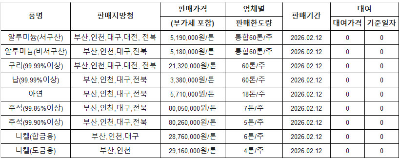 - ■ [표] 조달청 방출 가격(2월 10일)