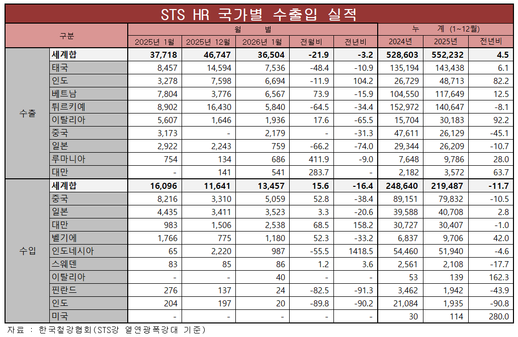 - ■ [표] 1월 열연강판 수출·수입 동반 감소