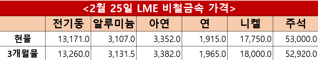 런던금속거래소(LME) 25일(현지시간) 기준 전기동 현물과 3개월물은 각각 톤당 13,171달러와 13,260달러를 기록했으며, 알루미늄은 3,170달러와 3,131.5달러, 아연은 3,352달러와 3,382달러로 집계됐다. 연은 1,915달러와 1,965달러, 니켈은 17,750달러와 18,000달러, 주석은 53,000달러와 52,920달러를 나타냈다.
