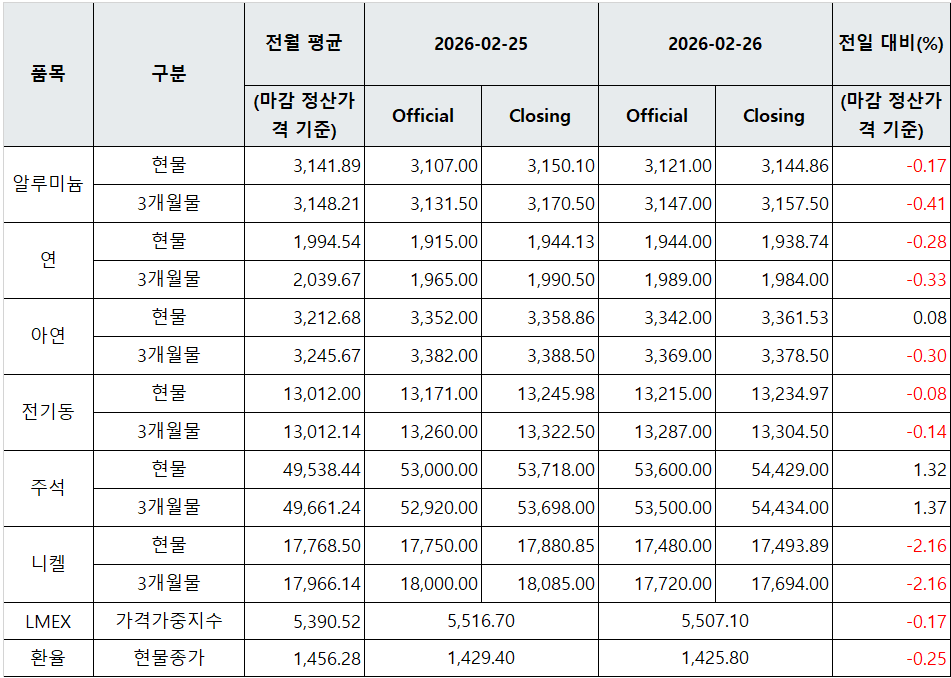[표] LME 비철금속 및 환율 동향(2월 26일)