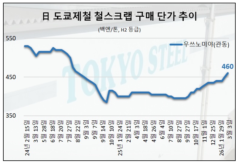 도쿄제철은 3일부로 철스크랩 구매 가격을 전 거점에서 톤당 1,000엔 인상한다고 밝혔다. 회사의 전 거점 철스크랩 가격 인상은 지난달 21일에 이어 올 들어 두 번째다.