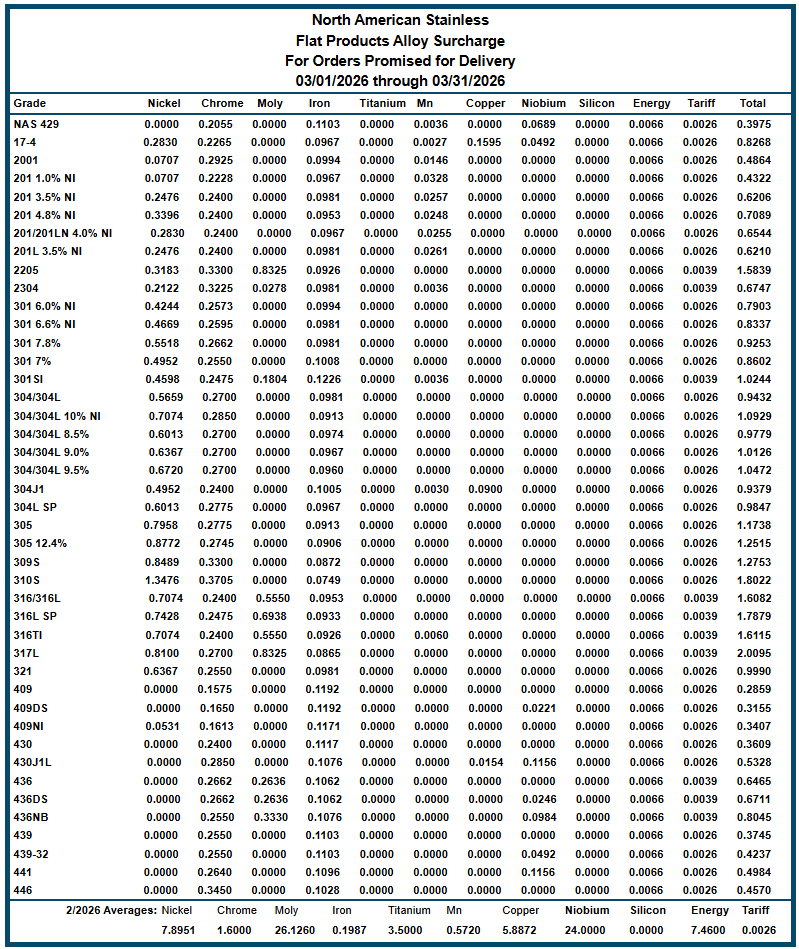 북미 최대 STS밀이자 유럽 아세리녹스의 미국 STS 생산법인인 NAS(North American Stainless)는 2026년 3월 STS 판재류의 합금 할증료(Alloy Surcharge)로 STS304(L) 강종을 파운드당 0.9432달러로 책정했다.
