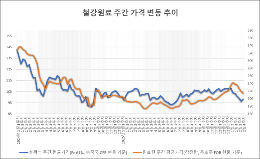 산업통상부 통계에 따르면, 철광석 가격(Fe 61%, 북중국 CFR 현물 기준)은 2월 넷째 주 평균 톤당 98.27달러로, 셋째 주와 비교해 1.87달러 오르며 5주 연속 하락 후 소폭 상승했다. 제철용 원료탄 가격(강점탄, 동호주 FOB 현물 기준)은 평균 214달러/톤으로 한 주 전보다 5달러 하락했다.