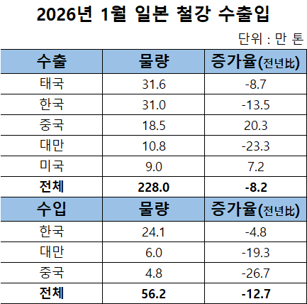 한편, 수입 감소세도 계속됐다. 일본의 1월 전철강 수입은 56만2천 톤으로 2025년 같은 달과 비교해 12.7% 줄었다. 이 중 보통강 완제품 수입은 35만1천 톤으로, 11.3% 감소하며 5개월 연속 줄었다. 지난해 연간 전철강, 보통강 완제품 수입은 각각 738만5천, 468만 톤으로 2024년 대비 5.9%, 7.3% 감소한 바 있다.