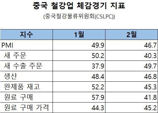 철강 수요를 가늠할 수 있는 하위 지수가 모두 50을 밑돌았다. 새 주문 지수는 40.3으로, 주문이 전월대비 감소했다는 응답이 증가했다는 응답보다 많았다. 2월엔 춘절 연휴(2월 15~23일) 영향으로 철강 수요가 뚜렷하게 줄었다는 분석이 제기됐다.