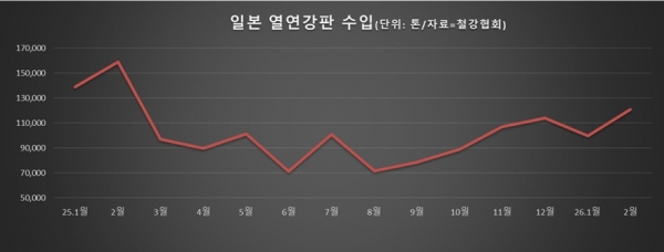 철강업계에 따르면 2월 일본산 열연강판 수입량은 12만840톤으로 집계됐다. 전월 9만9,878톤 대비 약 21% 증가한 규모다. 특히 올해 2월 물량은 지난해 2월 이후 약 1년 만에 가장 많은 수준으로 집계됐다.
