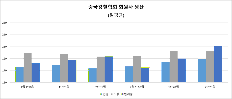 중국강철협회(CISA)에 따르면, 2월 21~28일 협회 회원사들의 일평균 선철 생산은 약 190만 톤으로 직전 기간(11~20일)과 비교해 2.9% 늘며 3기 연속 증가했다. 완제품 생산도 일평균 211만 톤으로 11% 늘며 2기 연속 증가했고, 올해 처음으로 200만 톤을 넘었다.