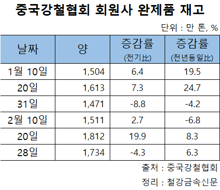 한편, 지난달 말 재고는 제강사, 유통 모두에서 전월대비 높은 수준을 나타냈다. 지난달 28일 기준 협회 회원사들의 완제품 재고는 1,734만 톤으로 1월 말일과 비교해 17.9%(263만 톤) 많았다.