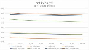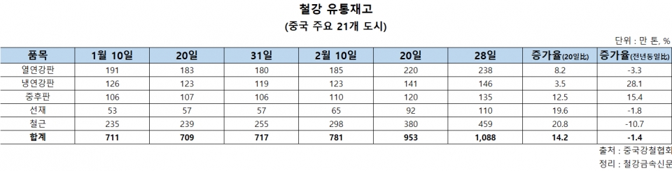 중국 주요 도시 21곳의 완제품 5종 유통재고도 지난달 말일 기준 1,088만 톤으로, 1월 31일 대비 51.7%(371만 톤) 증가하며 올해 최대치를 기록했다. 선재와 철근 재고가 각각 93%, 80% 늘어 110만, 459만 톤을 나타낸 가운데, 열연강판과 중후판 재고도 32.2%, 27.4% 증가해 238만, 135만 톤을 기록했다. 냉연강판 재고는 146만 톤으로 22.7% 증가했다.