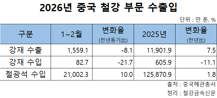 한편, 중국의 철강 수입은 지난해에 이어 감소세를 이어갔다. 1~2월 강재 수입은 82만7천 톤으로 지난해 같은 기간 대비 21.7% 줄었다. 수입액도 17억5,130만 달러로 16.4% 감소했다. 지난해 연간 수입(606만 톤)은 2024년 대비 11.1% 감소한 바 있다.