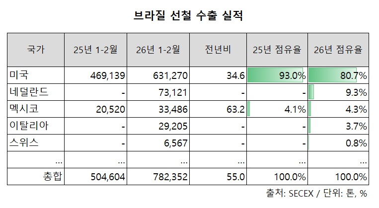 브라질 선철 수출은 미국향이 대부분인 만큼 미국 수입 철강 관세에 큰 타격을 받을 것으로 예상됐으나, 미국이 선철과 스크랩 등 원자재는 예외 품목으로 지정하면서 고율 관세 영향에서 벗어난 상황이다.