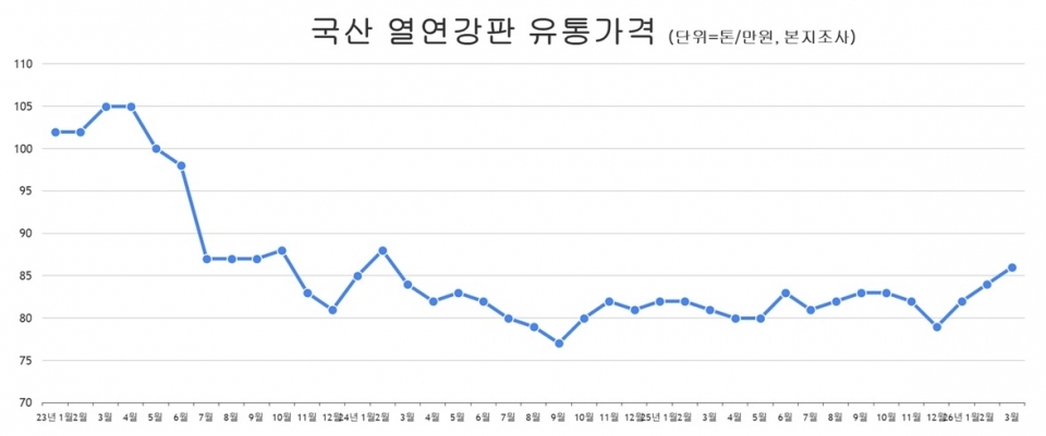 철강업계에 따르면 3월 기준 국산 열연강판 유통가격은 톤당 80만 원대 중후반 수준에서 형성되고 있다. 올해 1월 80만 원 초반에서 출발한 가격은 2월과 3월을 거치며 상승 흐름을 이어가고 있다.