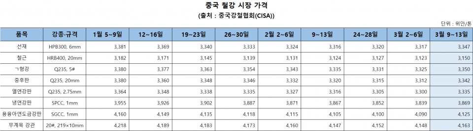 - ■ [오늘 중국은-표] 3월 첫째 주 중국 철강 가격 소폭 하락