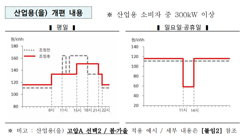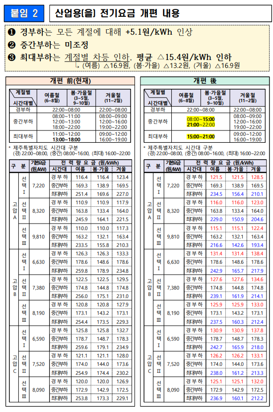 동시에 최대부하 시간대 적용되는 최고요금은 여름·겨울철 1kWh당 16.9원, 봄·가을철 13.2원 등 평균 15.4원 내린다. 경부하 시간대(봄·여름·가을 기준 오후 10시부터 이튿날 오전 8시까지)에 적용되는 최저요금은 1kWh당 5.1원 올린다.