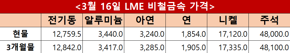 런던금속거래소(LME) 16일(현지시간) 기준 전기동 현물과 3개월물은 각각 톤당 12,759.5달러와 12,842달러를 기록했으며, 알루미늄은 3,440달러와 3,417달러, 아연은 3,240달러와 3,285달러로 집계됐다. 연은 1,854달러와 1,905달러, 니켈은 17,120달러와 17,335달러, 주석은 48,000달러와 48,100달러를 나타냈다.