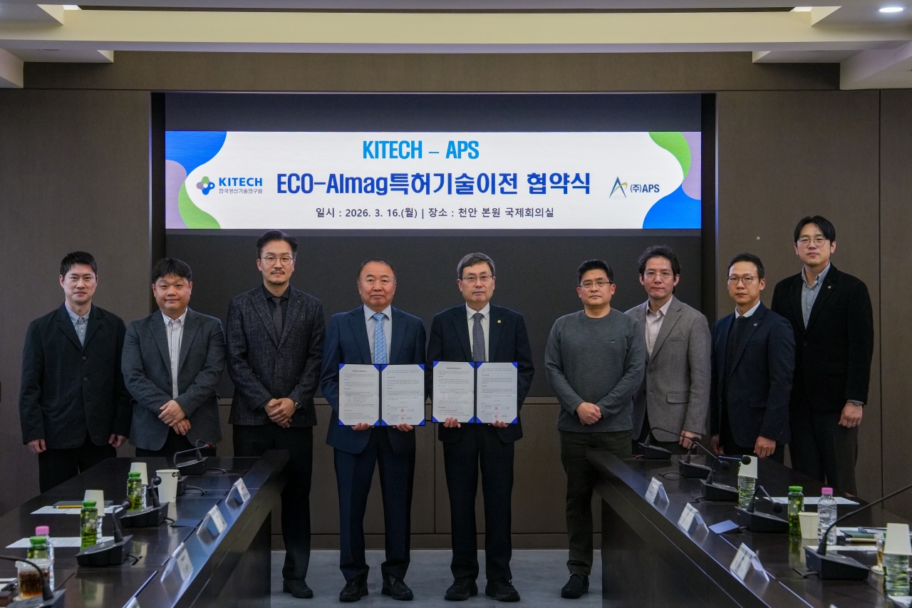 생기원은 지난 16일 천안 본원에서 ‘KITECH - APS 기술 이전 업무협약식’을 열었다. 협약식에는 이상목 원장과 APS 정기로 회장 등 양 기관 주요 관계자가 참석했으며 에코 알막 합금의 판재(Flat Rolled Products) 제조기술에 대한 특허사용 권리(통상실시권)를 공식 이전했다.