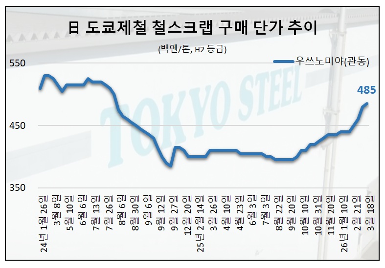 앞서 회사는 지난 12일에도 철스크랩 가격을 전 거점에서 톤당 2,000~2,500엔 올린 바 있다. 일본 철스크랩 수출 수요가 꾸준히 늘면서 도쿄제철도 추가 인상을 통해 내수 단속에 나서는 모습이다.