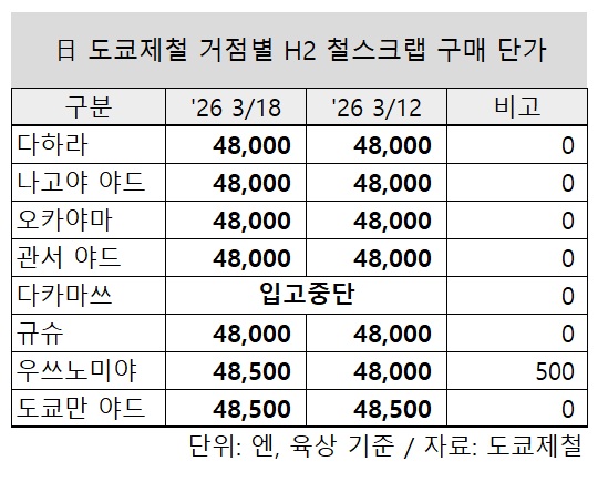 이번 인상으로 도쿄제철 거점별 철스크랩 구매 가격은 H2 등급 기준 △다하라 4만8,000엔 △나고야 야드 4만8,000엔 △오카야마 4만8,000엔 △관서 야드 4만8,000엔 △다카마쓰(입고중단) △규슈 4만8,000엔 △우쓰노미야 4만8,500엔(+500엔) △도쿄만 야드 4만8,500엔으로 상향 조정됐다.