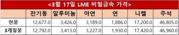 런던금속거래소(LME) 17일(현지시간) 기준 전기동 현물과 3개월물은 각각 톤당 12,677달러와 12,792달러를 기록했으며 알루미늄은 3,426달러와 3,413달러, 아연은 3,189달러와 3,227달러로 집계됐다. 연은 1,886달러와 1,930달러, 니켈은 17,200달러와 17,420달러, 주석은 46,805달러와 46,960달러를 나타냈다.