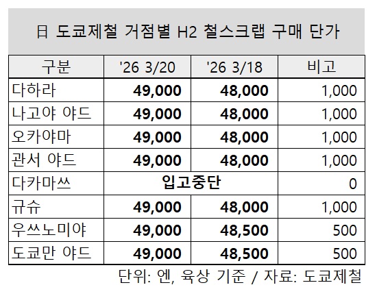 특히 우쓰노미야 공장 철스크랩 가격은 이틀 만에 추가 인상이다. 앞서 회사는 지난 18일에도 우쓰노미야 공장에 한해 톤당 500엔 올린 바 있다. 이번 인상으로 도쿄제철 모든 거점에서 H2 구매 가격은 톤당 4만9,000엔으로 통일된 모습이다.