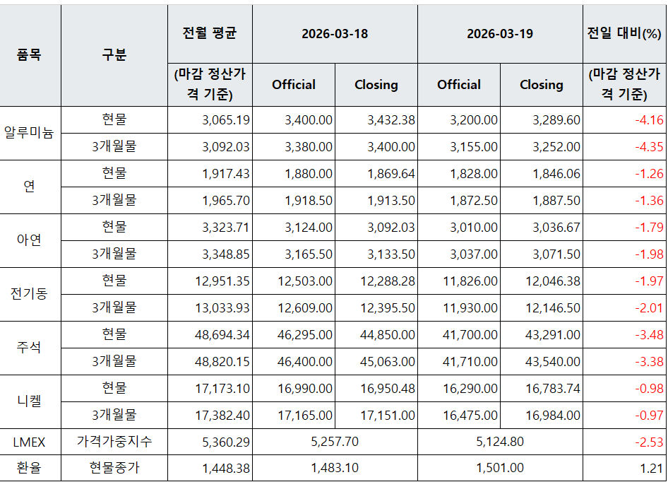 [표] LME 비철금속 및 환율 동향(3월 19일)
