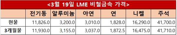 런던금속거래소(LME) 19일(현지시간) 기준 전기동 현물과 3개월물은 각각 톤당 11,826달러와 11,930달러를 기록했으며 알루미늄은 3,200달러와 3,155달러, 아연은 3,010달러와 3,037달러로 집계됐다. 연은 1,828달러와 1,872.5달러, 니켈은 16,290달러와 16,475달러, 주석은 41,700달러와 41,710달러를 나타냈다.