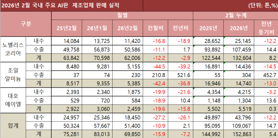 국내 알루미늄판 업체들의 2월 전체 실적이 부진한 것으로 나타났다. 본지에서 집계한 2월 국내 알루미늄판 3사(노벨리스코리아, 조일알미늄, 대호에이엘)의 전체 판매 실적은 총 6만9,850톤으로 지난해 2월 7만5,281톤보다 7.2% 줄어들었다.