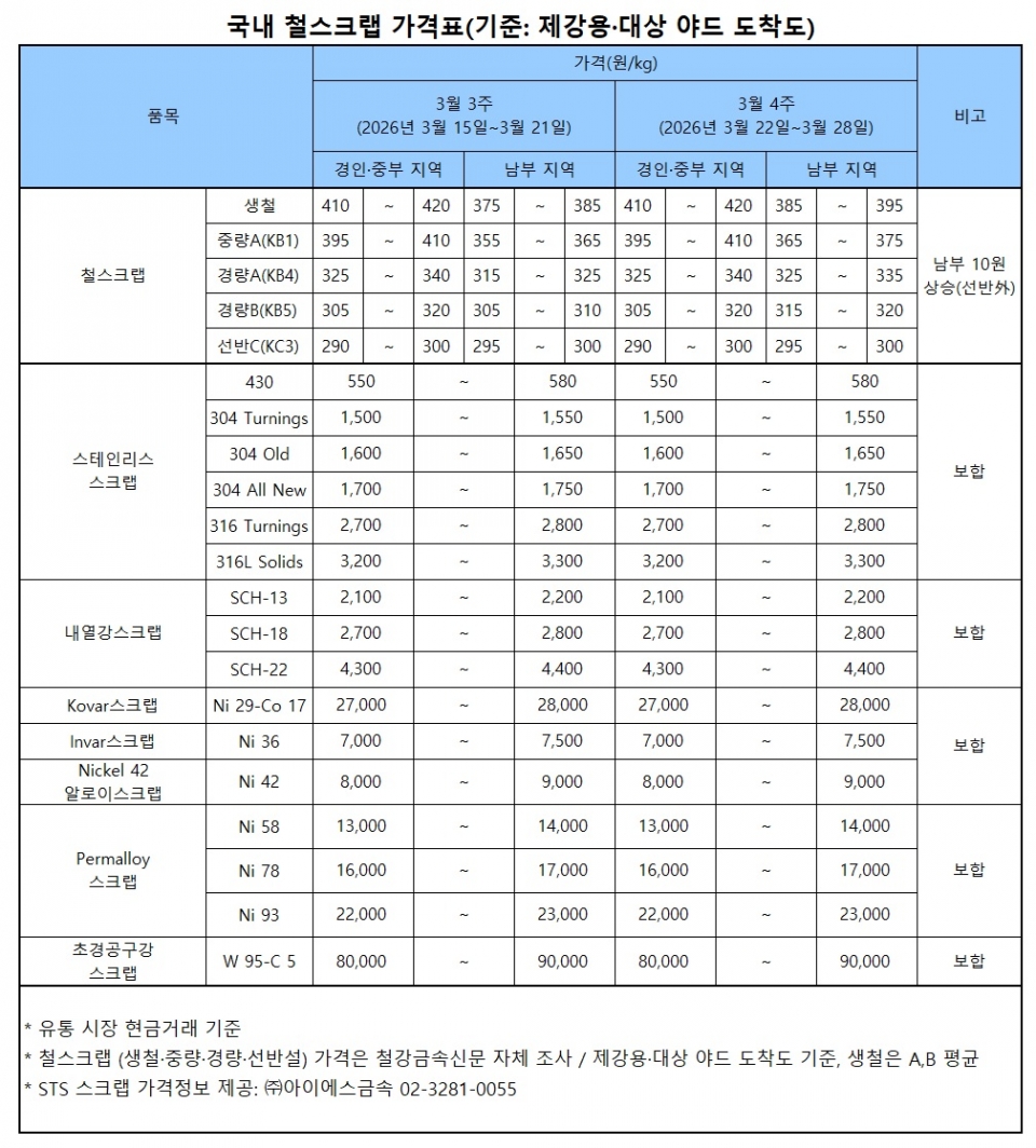3월 넷째 주 경인·중부권 철스크랩 가격은 환영철강공업의 특별구매에도 현대제철과 동국제강이 다음달 인하를 예고하면서 보합세를 유지했다.