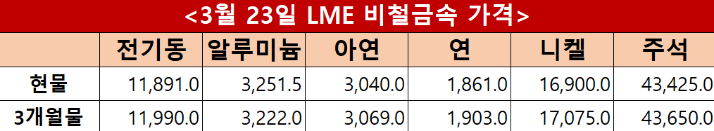 런던금속거래소(LME) 23일(현지시간) 기준 전기동 현물과 3개월물은 각각 톤당 11,891달러와 11,990달러를 기록했으며, 알루미늄은 3,251.5달러와 3,222달러, 아연은 3,040달러와 3,069달러로 집계됐다. 연은 1,861달러와 1,903달러, 니켈은 16,900달러와 17,075달러, 주석은 43,425달러와 43,650달러를 나타냈다.