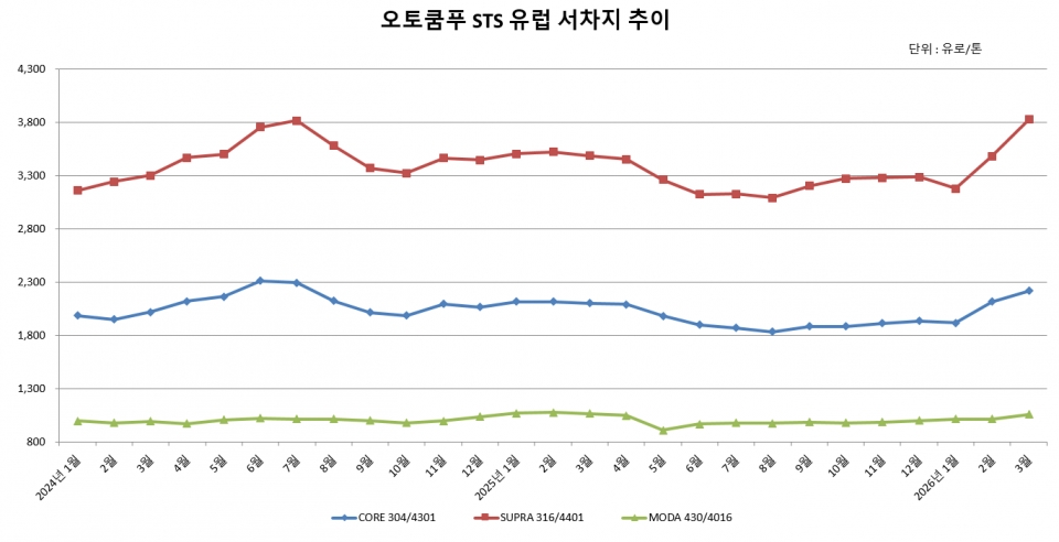이런 가운데 오토쿰푸는 400계 가격도 인상했지만 인상 폭 수준은 300계와 비교해 2월에 이어 비교적 낮은 폭으로 책정했다. 3월 STS430(MODA 4016) 강종 할증료는 톤당 1,058유로로 전월 대비 42유로 인상했다. 300계보다 긴 5개월 연속 결정이지만 매월 인상 수준이 상대적으로 낮아, 이 기간 총인상 폭이 81유로(14.1만 원)에 그친다.