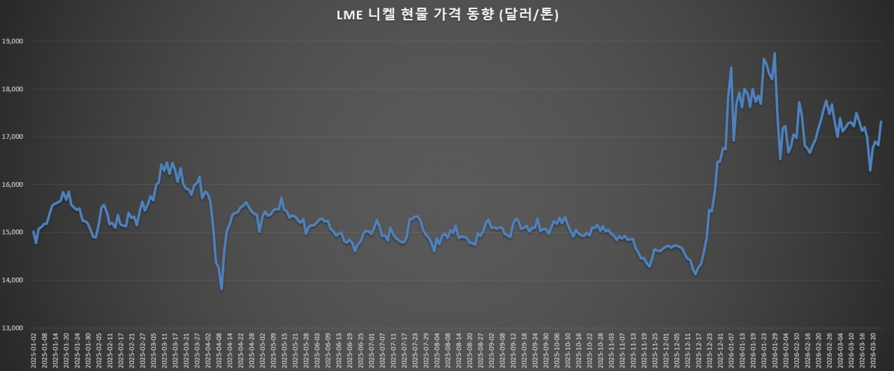 여기에 더해 원재료 가격 자체도 강보합세를 보이고 있다. 런던금속거래소(LME)에서 니켈 현물 가격은 3월 중하순 1만 7천 달러 전후 수준으로, 1월 초순부터 시작된 박스권 돌파(2025년 4월~12월/1만 4천~1만 5천 달러) 흐름이 이어지고 있다.