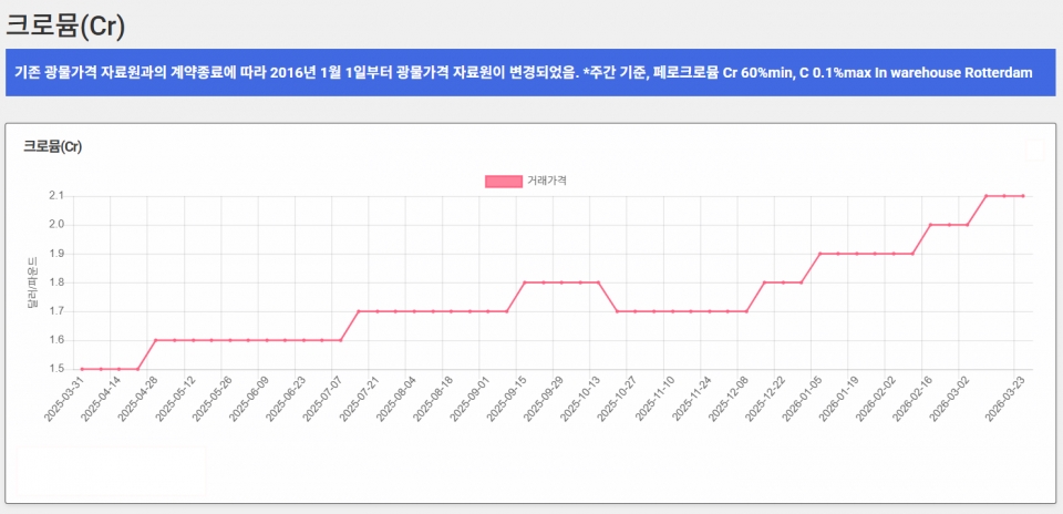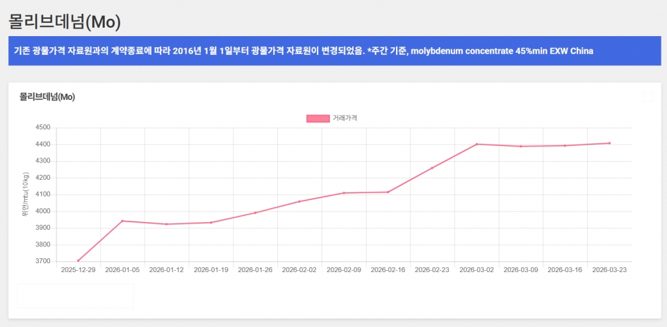 또한 1분기 남아프리카 페로크로뮴 공급자의 분기 협상 가격이 2025년 1분기 이후 최고 수준을 유지한 가운데 글로벌 STS조강 생산 확대 및 수급 불안정으로 2분기 이후 가격도 강보합세가 전망되고 있다. 게다가 근래 STS 원가를 가장 크게 자극하고 있는 원료인 몰리브데넘 가격은 45% 정광 기준 중국 시장 거래 가격이 연초보다 11% 오른 mtu(10㎏)당 4,407위안으로 현재까지도 상승세가 이어지고 있다.