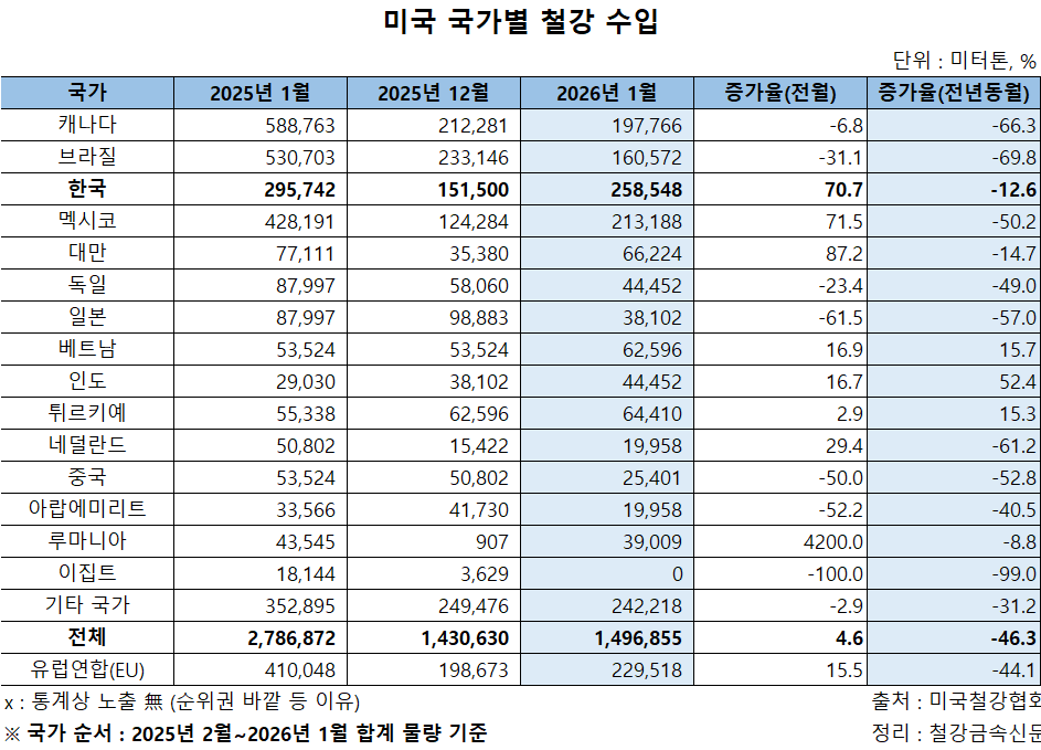 [표] 1월 미국 철강 수입, '관세율 만큼' 급감