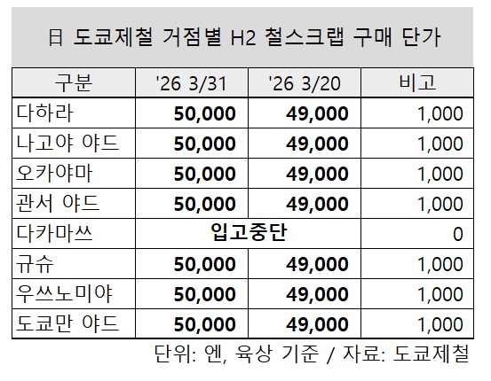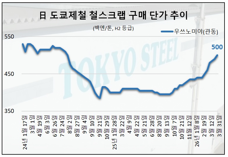회사의 전 거점 철스크랩 가격 인상은 3월에만 네 번째다. 엔화 약세와 함께 달러 기준 수출 가격 강세가 이어지면서 도쿄제철도 적극 인상을 통해 수출 시장과 경쟁에 나서는 상황이다.