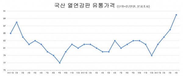 본지가 집계한 자료에 따르면 2026년 4월 기준 열연강판 유통가격은 톤당 90만 원대에 올라섰다. 이는 2023년 10월 이후 처음으로, 약 2년 반 만에 고점을 다시 넘어선 수준이다.