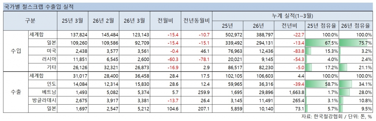 건설경기 회복 지연 속 국내 철스크랩 수입이 지난해에 이어 올해도 역대 최저 페이스를 이어가고 있다. 중동 전쟁 여파로 인한 글로벌 강세와 원화 약세 등 수입 여건 악화에 당분간 제강사 국내 구매 강화 기조는 지속될 것으로 보인다.
