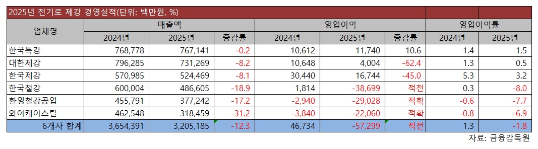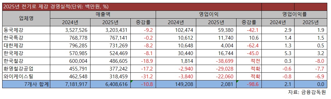 본지가 금융감독원 자료를 통해 △동국제강 △한국특강 △대한제강 △한국제강 △한국철강 △환영철강공업 △와이케이스틸(YK스틸) 등 전기로 제강 7개사 경영실적을 집계한 결과, 지난해 이들 매출액은 총 6조4,086억원으로 전년 대비 10.8% 줄었으며, 특히 영업이익은 98.6% 급감한 21억원에 그쳤다.