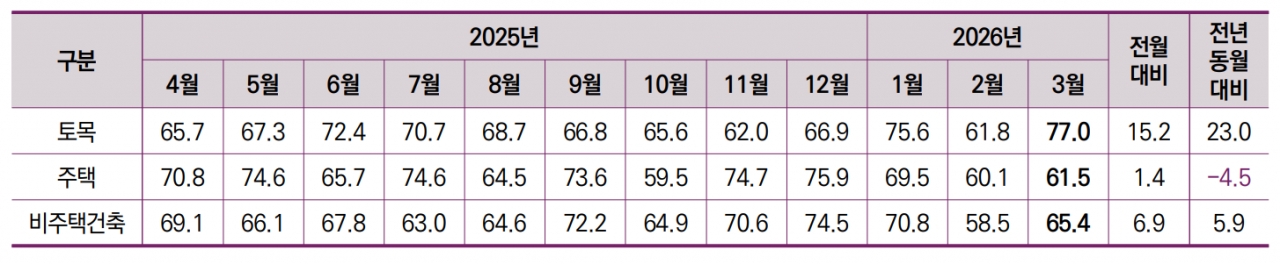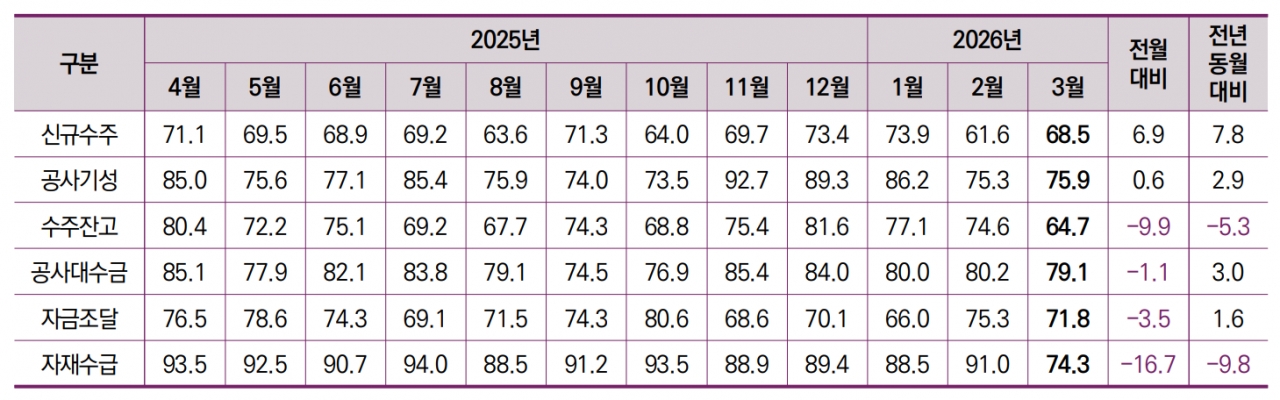 중동 사태에 따른 원자재 시장 불안 등 공급 여건 악화가 반영된 결과라고 이 연구원은 진단했다. 수주잔고지수(64.7) 역시 9.9p 하락하며 향후 공사 여력의 약화를 시사했다.