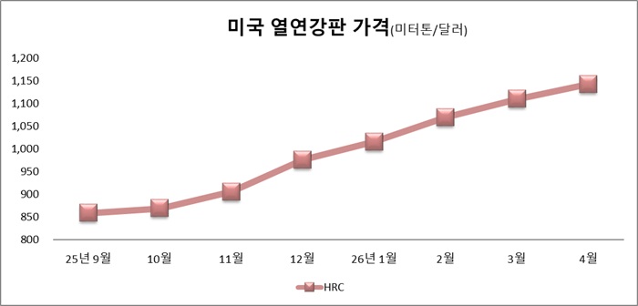 본지가 집계한 자료에 따르면 미국 열연강판 가격은 2025년 9월 톤당 859달러에서 2026년 4월 1,143달러까지 올랐다. 8개월 연속 상승이며, 누적 상승 폭은 약 284달러에 이른다. 특히 미국 열연강판 가격은 1년 만에 가장 높은 수준이라는 평가가 나온다.