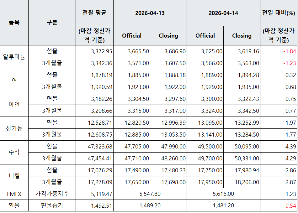 [표] LME 비철금속 및 환율 동향(4월 14일)