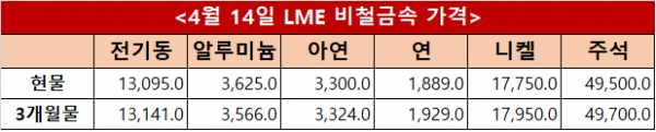 런던금속거래소(LME) 14일(현지시간) 기준 전기동 현물과 3개월물은 각각 톤당 13,095달러와 13,141달러를 기록했으며 알루미늄은 3,625달러와 3,566달러, 아연은 3,300달러와 3,324달러로 집계됐다. 연은 1,889달러와 1,929달러, 니켈은 17,750달러와 17,950달러, 주석은 49,500달러와 49,700달러를 나타냈다.