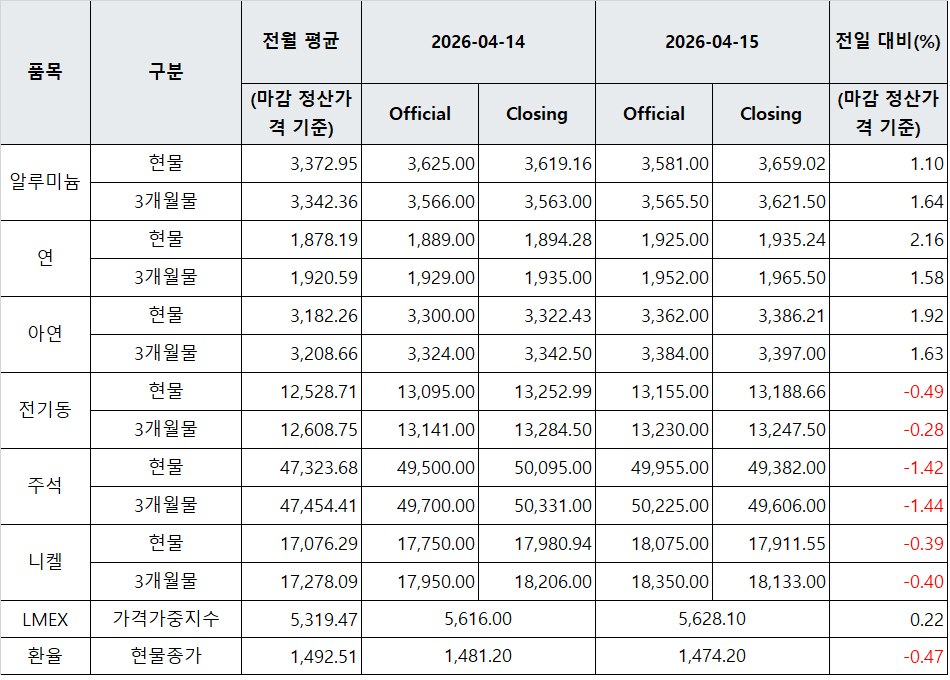 [표] LME 비철금속 및 환율 동향(4월 15일)