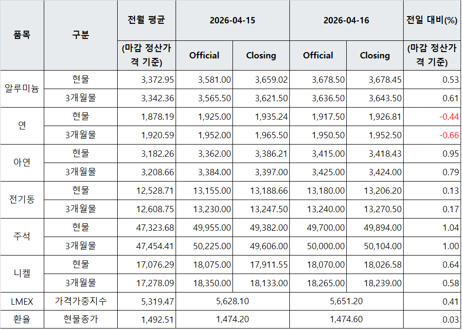 [표] LME 비철금속 및 환율 동향(4월 16일)