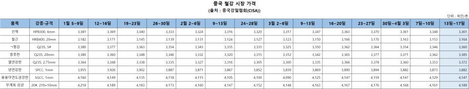 - ■ [오늘 중국은-표] 8일 중국 철강 내수 가격