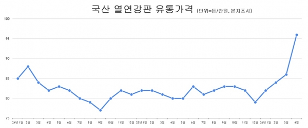 철강업계에 따르면 최근 국산 열연강판 유통가격은 톤당 90만 원대 중후반에서 형성되고 있다. 일부 물량은 톤당 100만 원대 진입을 시도하는 수준까지 제시되고 있다.